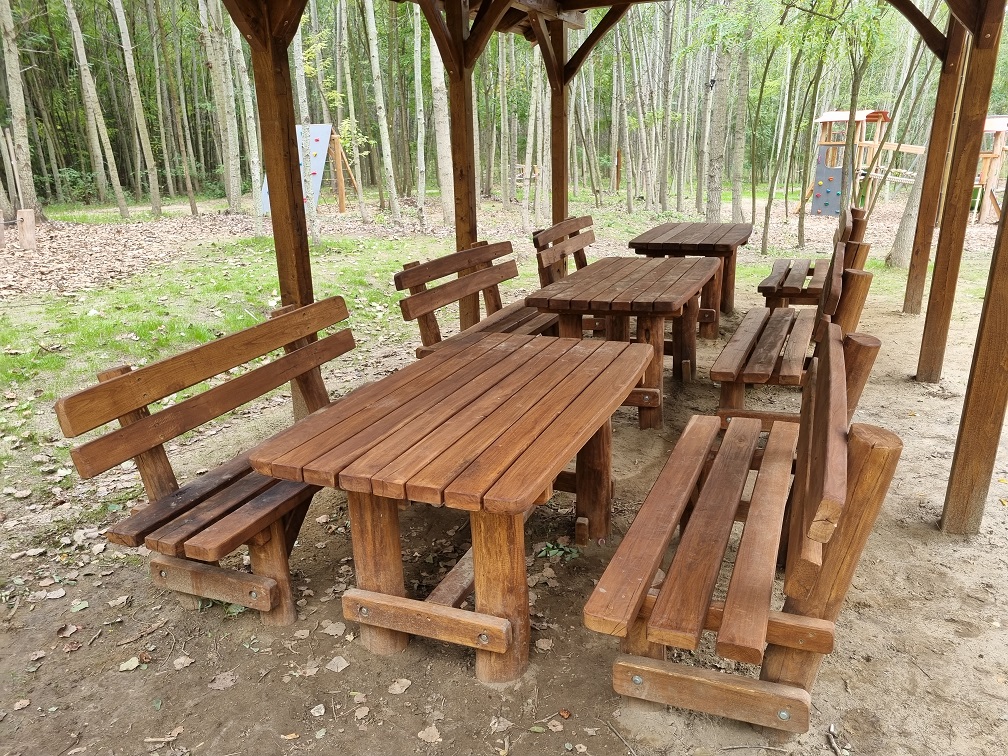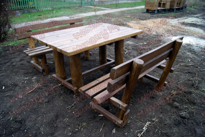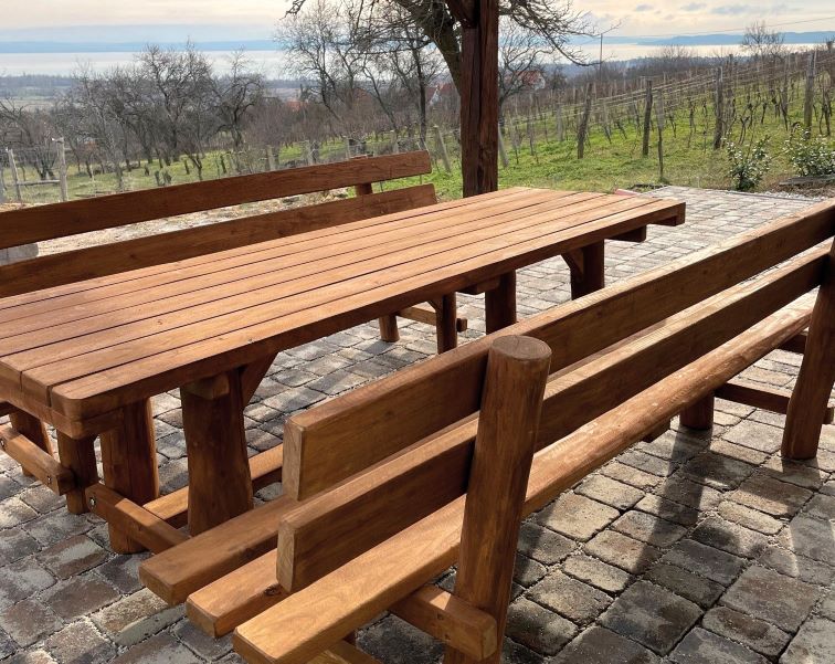 Csiszolt akácrönkökből és 2 colos (5 cm-es) akáclécekből összeállított asztal két darab háttámlás paddal